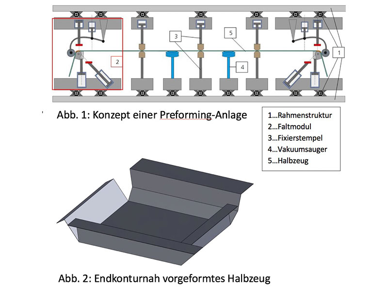 Im bisherigen Projektverlauf konnte der Vorwärmprozess für thermoplastische Faserhalbzeuge untersucht und validiert werden. Basierend auf diesen Ergebnissen erfolgt gegenwärtig die Konzeption einer Preforming-Anlage zur Erzeugung dreidimensional vorgeformter Halbzeuge durch die im Pressprozess geometrisch komplexe Bauteile abgebildet werden können (vgl. siehe Abbildung).