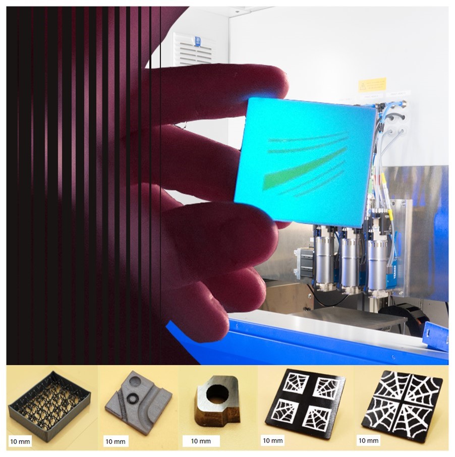 Das am Fraunhofer IKTS entwickelte additive Fertigungsverfahren Multi-Material-Jetting (CerAM MMJ) zeichnet sich durch ein nahezu unbegrenztes Portfolio an verarbeitbaren Werkstoffen (Polymere, Metalle, Keramiken, Gläser) und der Möglichkeit zur additiven Fertigung von Multi-Materialbauteilen aus. Dabei werden die verschiedenen Massen als Einzeltropfen abgelegt und miteinander verschmolzen.