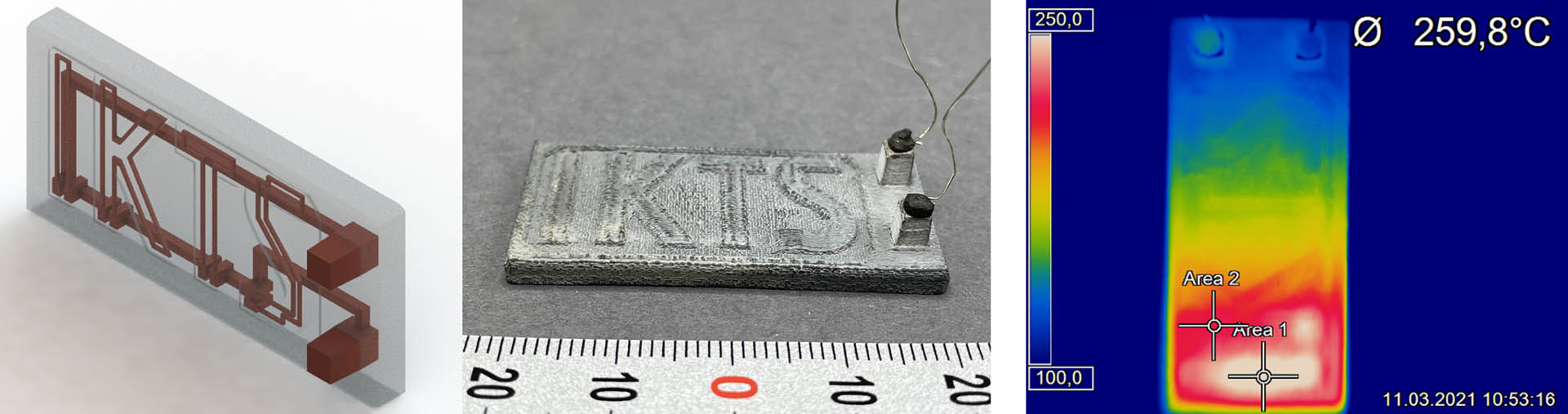 Exemplarische Heizerstruktur (links: CAD; Mitte: co-gesintertes und kontaktiertes Bauteil; rechts: thermografische Aufnahme während eines Laborversuches). (© Fraunhofer IKTS) -