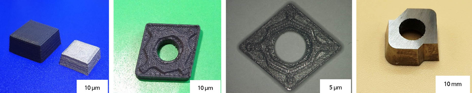 Hartmetall (WC-Co) Wendeschneidplatten-Rohlinge v.l.n.r.: Rohling im Grünzustand verglichen mit dem Sinterkörper, Wendeschneidplatte mit Spanbrechgeometrie im Grünzustand, Wendeschneidplatte mit Spanbrechgeometrie im gesinterten Zustand, gesinterter und g -