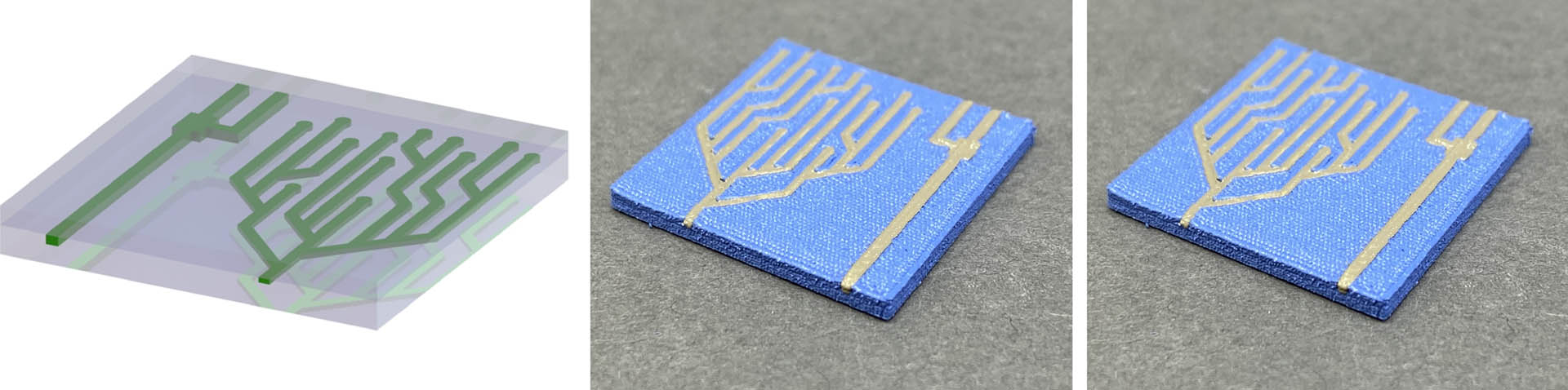 LTCC-Demonstrator mit integrierten Leiterbahnen (Ag) (links: CAD, Mitte: Platte bei 50% der Fertigstellung (grün), rechts: Platte mit vergrabenen Leiterbahnen (grün) (© Fraunhofer IKTS) -