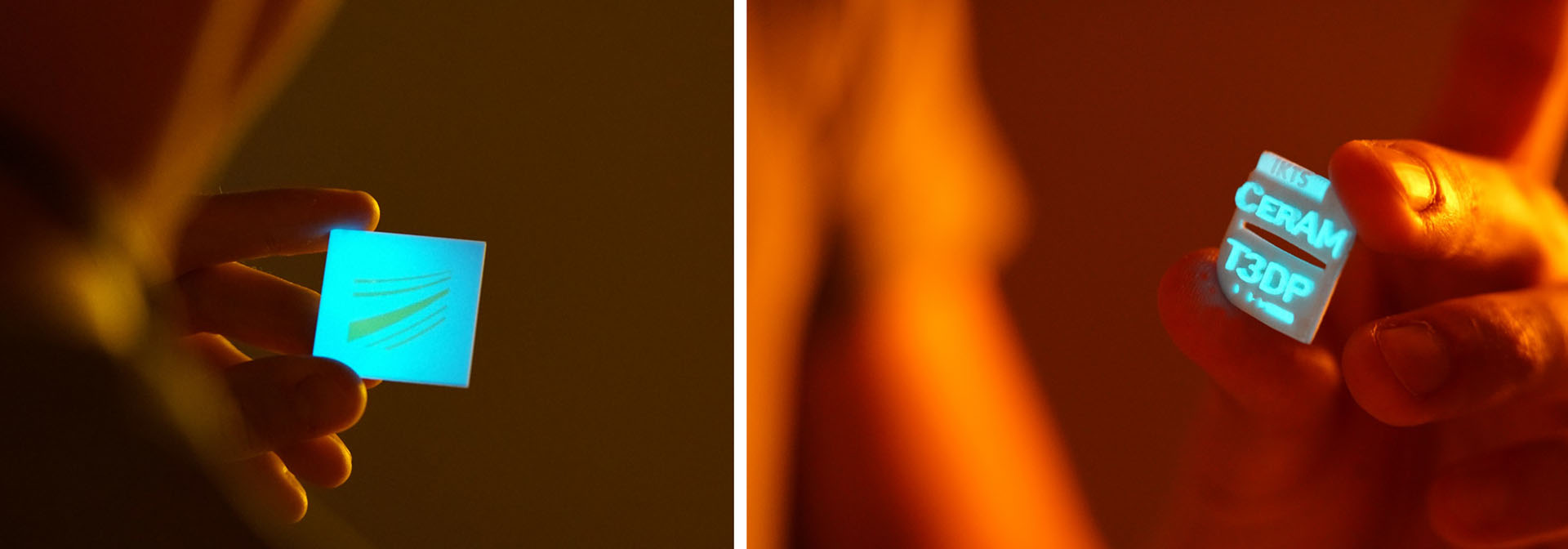 Phosphoreszierende Sinterglas-Demonstratoren (links: Platte mit Fraunhofer-Logo, rechts: Demonstrator mit T3DP-Aufschrift (ehemalige Bezeichnung der Multi Material Jetting Technologie) (© Fraunhofer IKTS) -