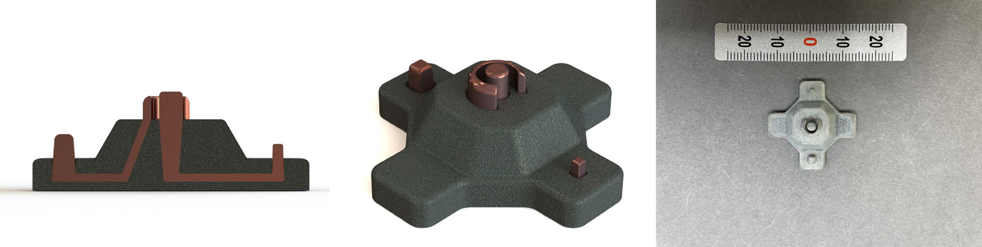 Keramische Zündquelle aus Si3N4-MoSi2 (links und Mitte: CAD; rechts: co-gesintertes Bauteil). (© Fraunhofer IKTS)